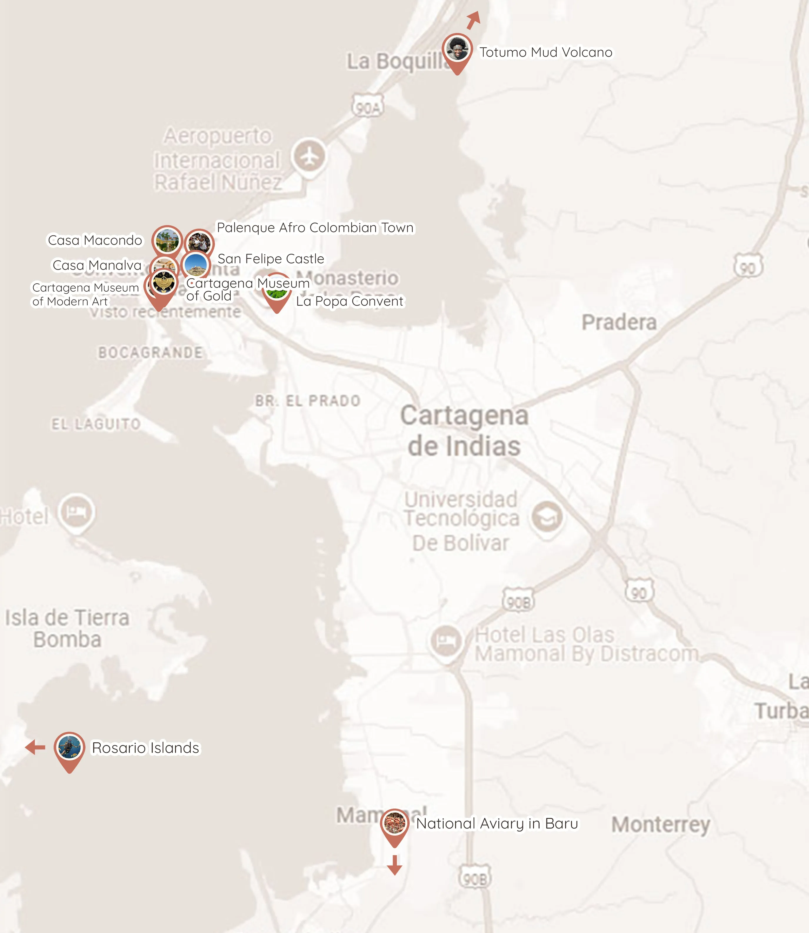 • Aviario Nacional de Colombia (Barú) – A vast aviary with over 170 bird species, including f lamingos,macaws, and toucans. • Rosario Islands by Yacht – A private boat trip with snorkeling, turquoise waters, and white-sand beaches.